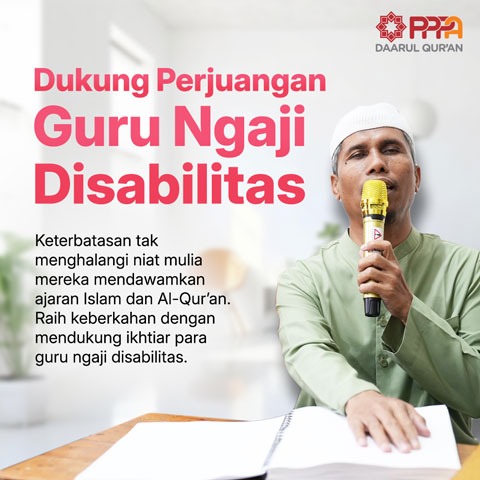 Mereka adalah guru-guru disabilitas yang tak kenal lelah mengajarkan santri-santrinya mentaddaburi Kalamullah. Meski dalam keterbatasan, para pahlawan disabilitas ini tetap dengan sabar menjalankan tugasnya. Tentu begitu banyak tantangan yang meraka hadapi di jalan kebaikan ini, tapi tetap mereka jalani tanpa mengharap imbalan apapun.