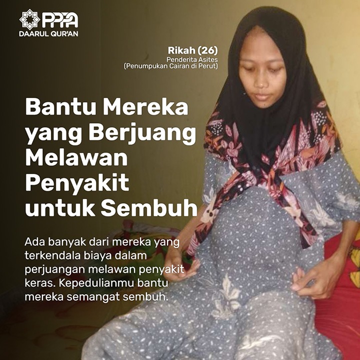 Salah satunya Rikah yang ditemui Laznas PPPA Daarul Qur’an di wilayah Tangerang. Usianya masih 26 tahun, namun sudah harus melawat asites (penumpukan cairan di dalam perut) setelah melahirkan anak kedua.