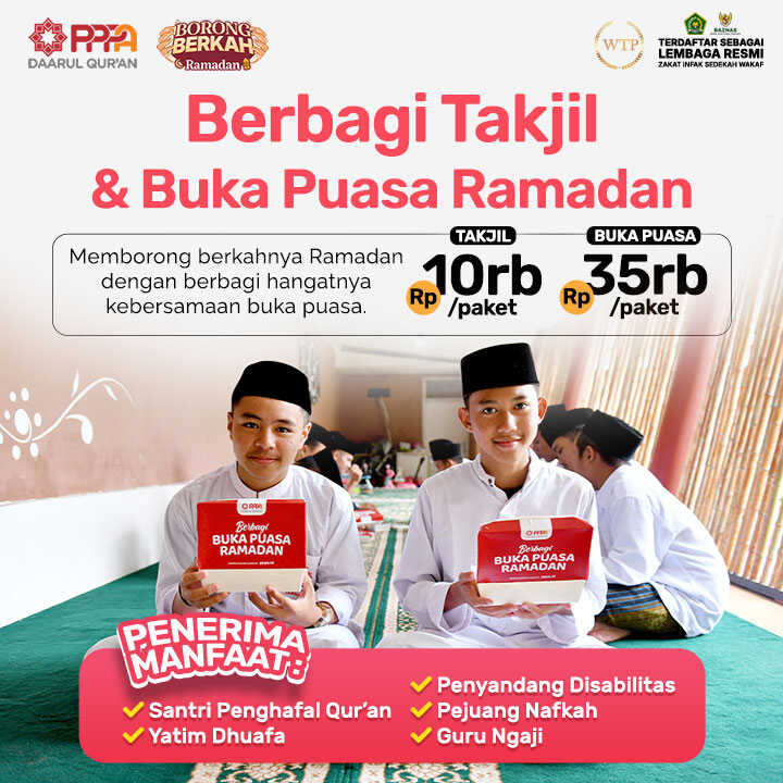 Dalam berkah Ramadan, setiap takjil yang kamu bagikan menjadi cahaya bagi mereka yang membutuhkan. Terutama para santri penghafal Qur'an dan dhuafa di rumah-rumah tahfizh pesantren, guru ngaji, sahabat disabilitas, pejuang nafkah serta kantong-kantong kemiskinan yang menantikan dukungan hangatmu.