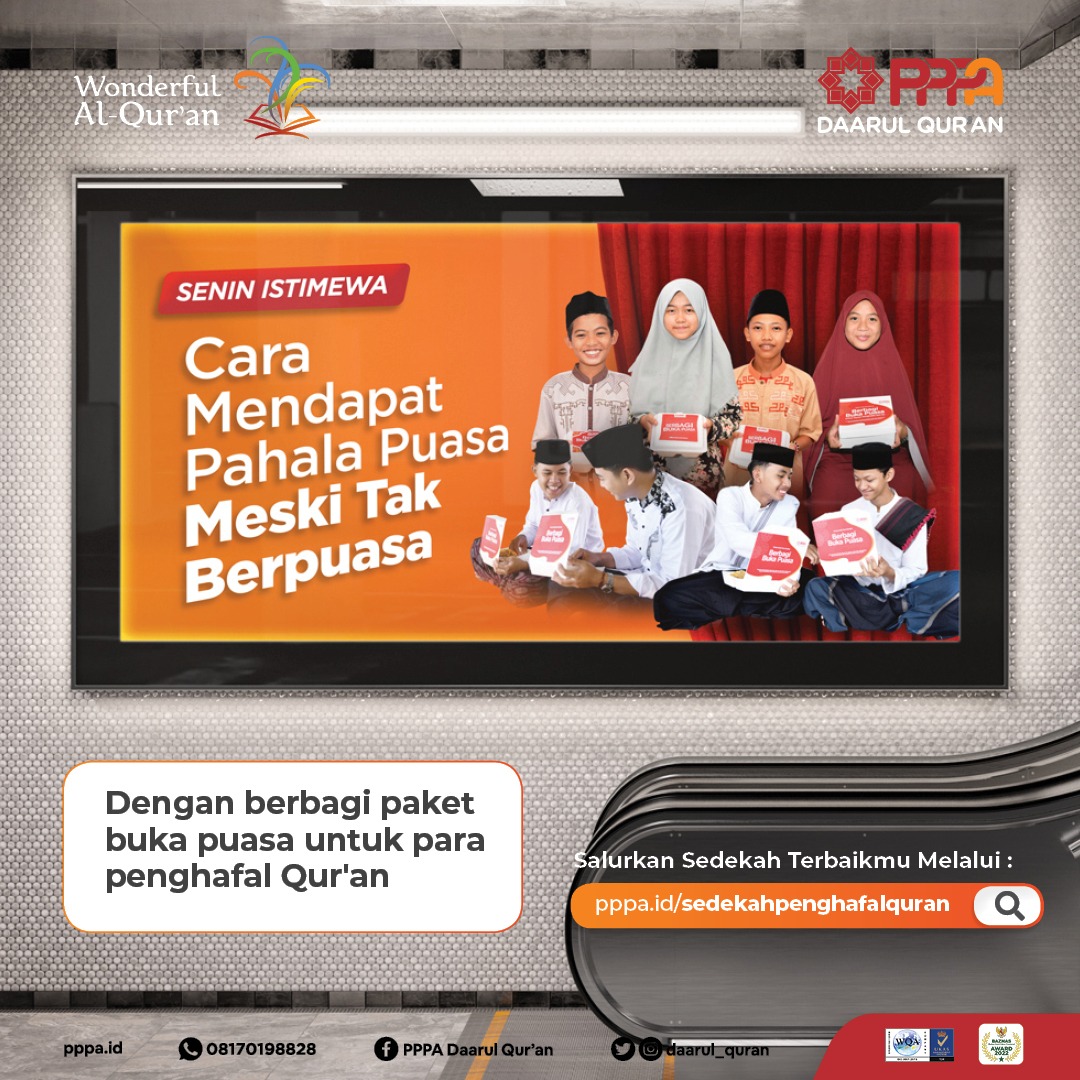 Karenanya, kami mengajak Bapak/Ibu, sahabat dan seluruh donatur meraih pahala berlipat ganda dengan turut menyediakan hidangan buka puasa terbaik untuk para santri.