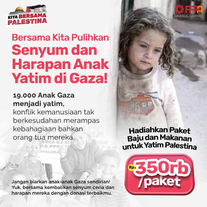 19.000 Anak Gaza menjadi yatim, konflik kemanusiaan tak berkesudahan merampas kebahagiaan bahkan orang tua mereka. Jangan biarkan anak-anak Gaza sendirian! Yuk, bersama kembalikan senyum ceria dan harapan mereka dengan donasi terbaikmu.