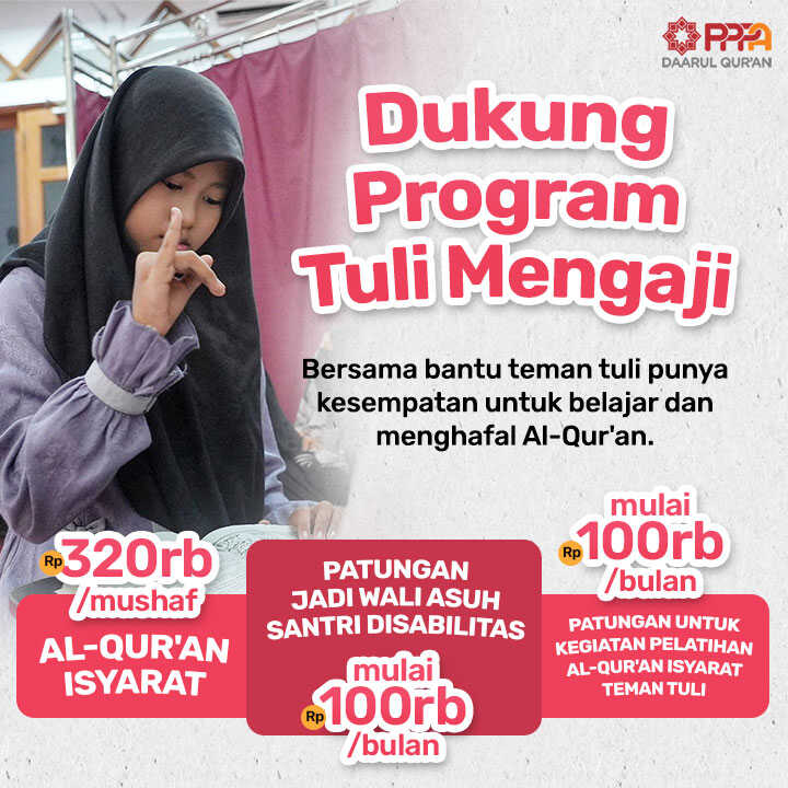 Menanggapi hal tersebut, Laznas PPPA Daarul Qur’an mengusung program “Tuli Mengaji”. Kegiatan yang diharapkan bisa menjadi jalan teman tuli bisa membaca dan menghafal Al-Qur’an Isyarat.